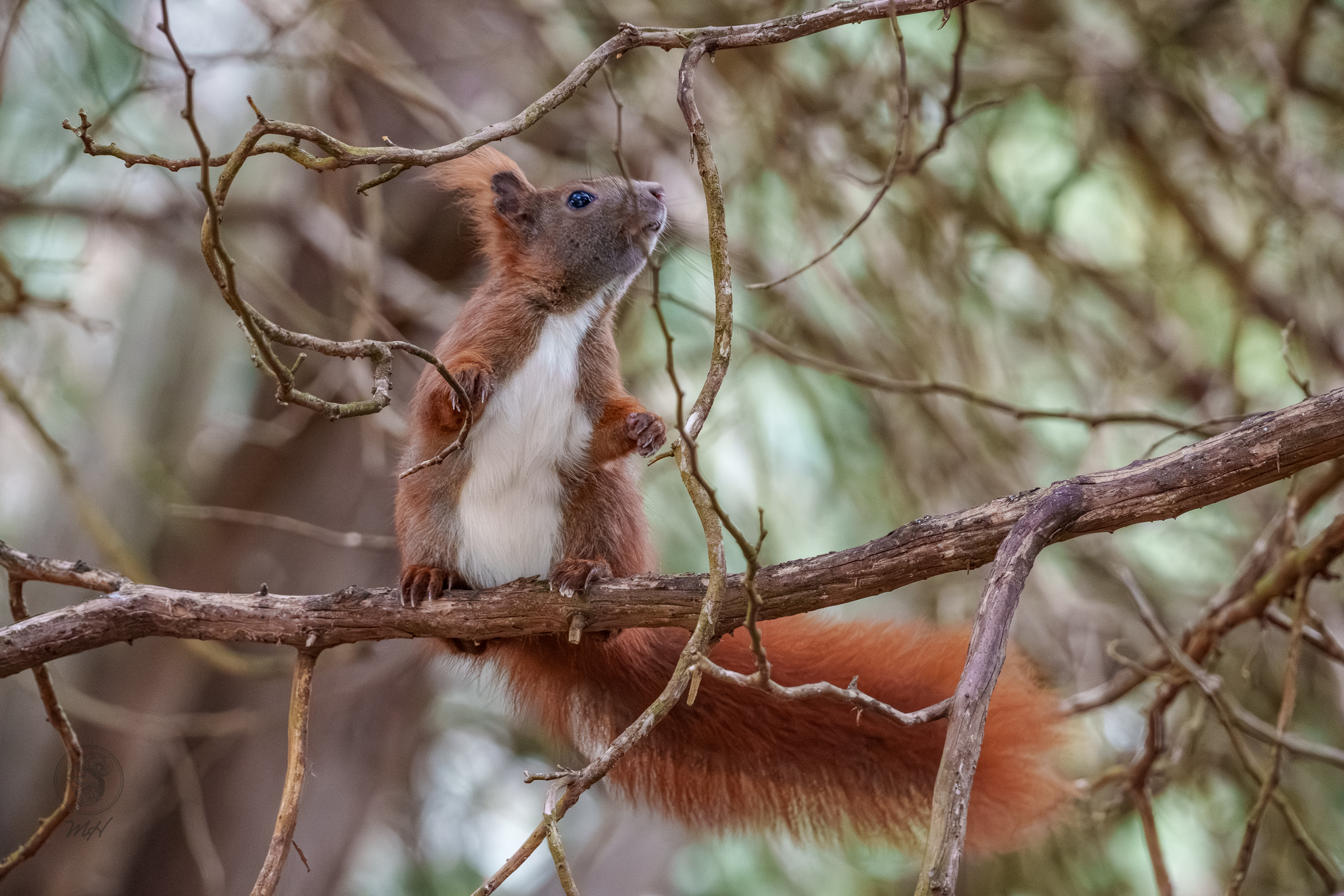 Ein Eichhörnchen sitzt auf einem Ast im Wald. Es blickt nach oben.