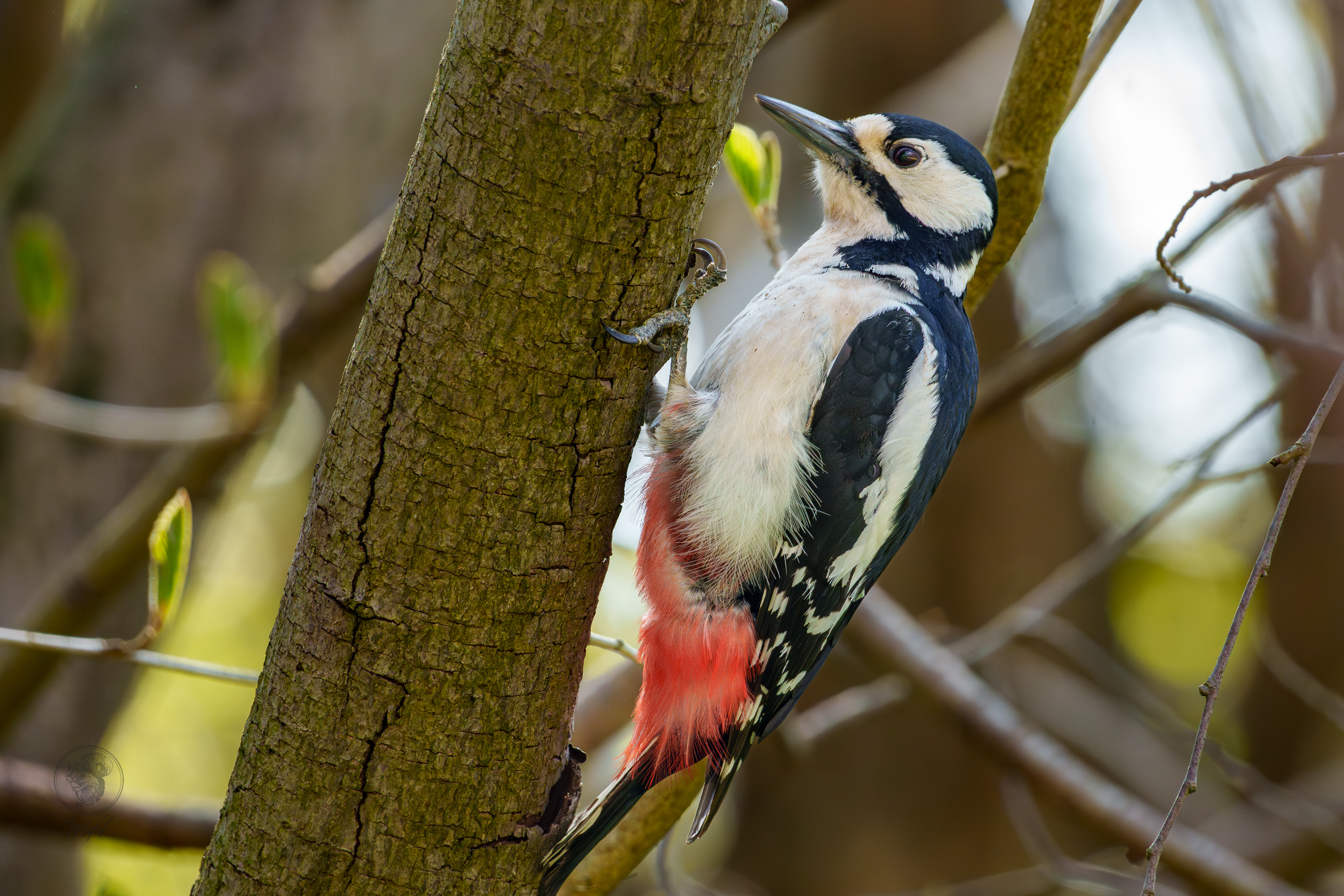 Ein Specht hängt an einem Baumstamm.