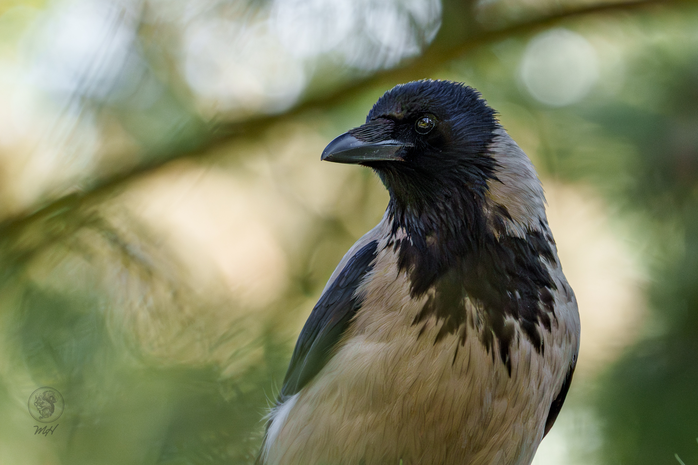Eine Krähe schaut nach links.